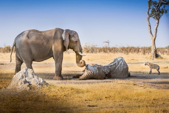 Foto yang luar biasa ini, diambil oleh John Chaney sebagai bagian dari lomba foto National Geographic Traveler 2012. Chaney menulis bahwa gajah betina dalam foto ini, yang diambil pada tahun 2007, berjaga-jaga disamping tubuh kaku temannya yang telah mati selama berjam-jam untuk memberikan penghormatan terakhir padanya, serta menjaganya dari burung pemangsa dan predator lainnya seperti hyena. Dia kemudian membelitkan belalainya pada gading temannya sebagai salam perpisahan yang memilukan.