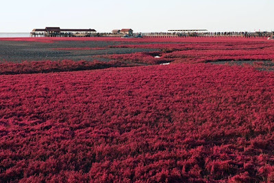 Pantai Merah terletak di Delta Sungai Liaohe, sekitar 30 kilometer dari barat daya Kota Panjin di Cina. Pantai mendapatkan namanya dari penampilannya, yang disebabkan oleh jenis rumput laut yang tumbuh subur di tanah salin-alkali. Rumput yang mulai tumbuh pada bulan April atau Mei tetap hijau selama musim panas. Pada musim gugur, gulma ini ternyata menyala merah, dan pantai terlihat seolah-olah tertutup oleh karpet merah sejauh mata memandang yang menciptakan lanskap laut berwarna merah yang langka Sebagian besar Pantai Merah adalah cagar alam dan tertutup untuk umum. Hanya sebagian kecil, dan terpencil, yang dibuka bagi wisatawan. Laut yang Menyala, Horn of Africa